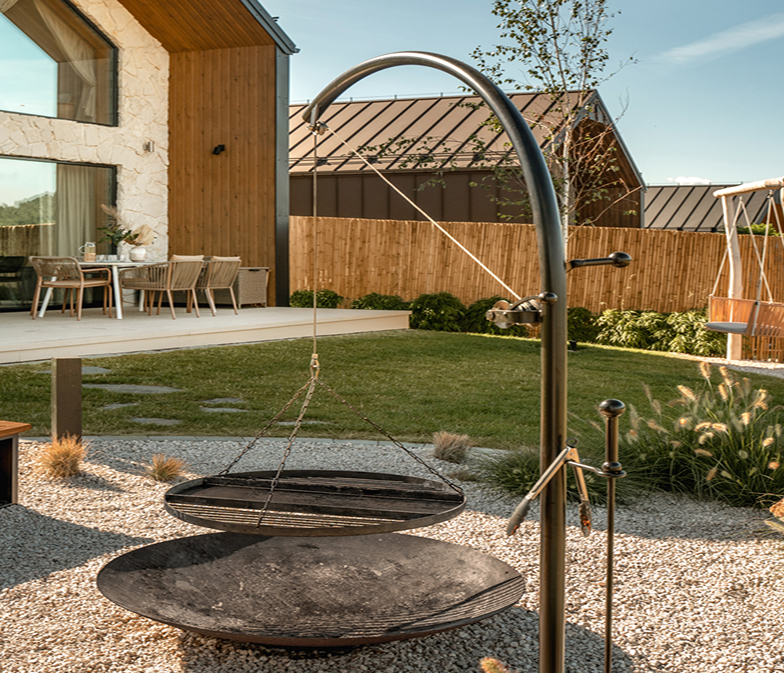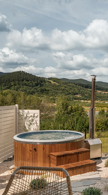 Mucharskie Wzgórze to synonim relaksu, dlatego każdy domek wyposażyliśmy w prywatne balie ogrodowe z gorącą wodą, wydzielone strefy na grill i ognisko oraz taras z dużym stołem.