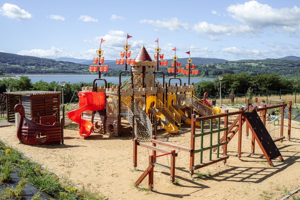Nowoczesny plac zabaw w Dąbrówce to idealne miejsce na rodzinną rekreację, oferujące bezpieczną zabawę z malowniczym widokiem na jezioro.
